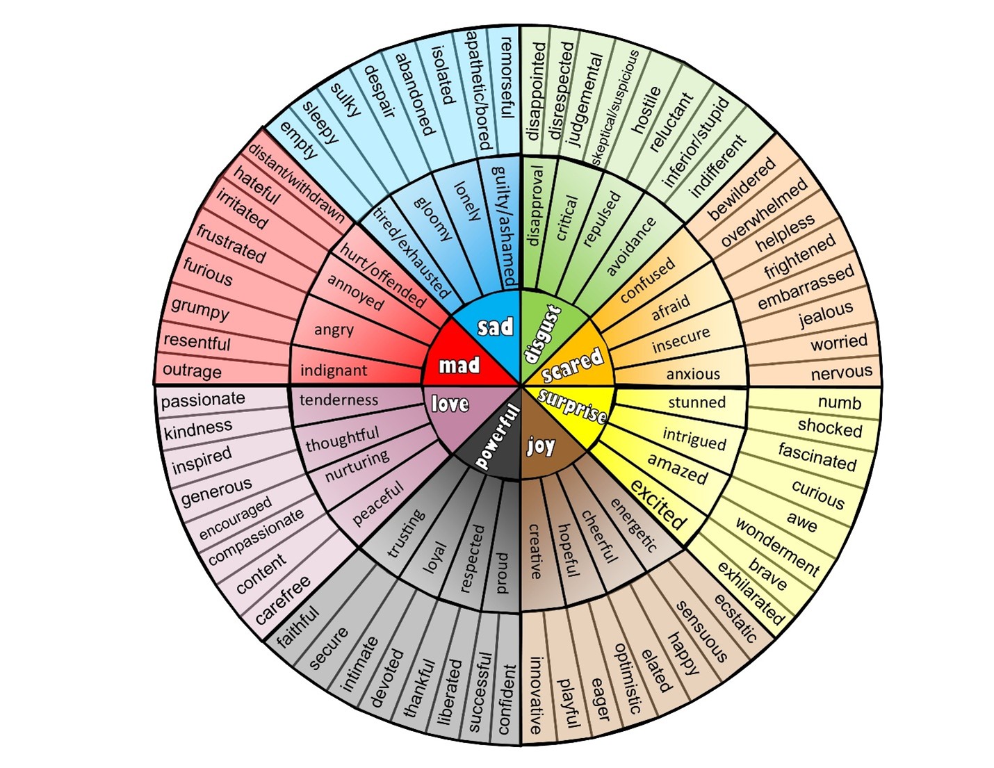 This is a feelings wheel (click the image and save to download). I made this one. There are many other kinds. Gloria Wilcox is known as being the pioneer of this tool. She made hers as a visual aid that helped folks acknowledge and communicate about their feelings and work towards change.